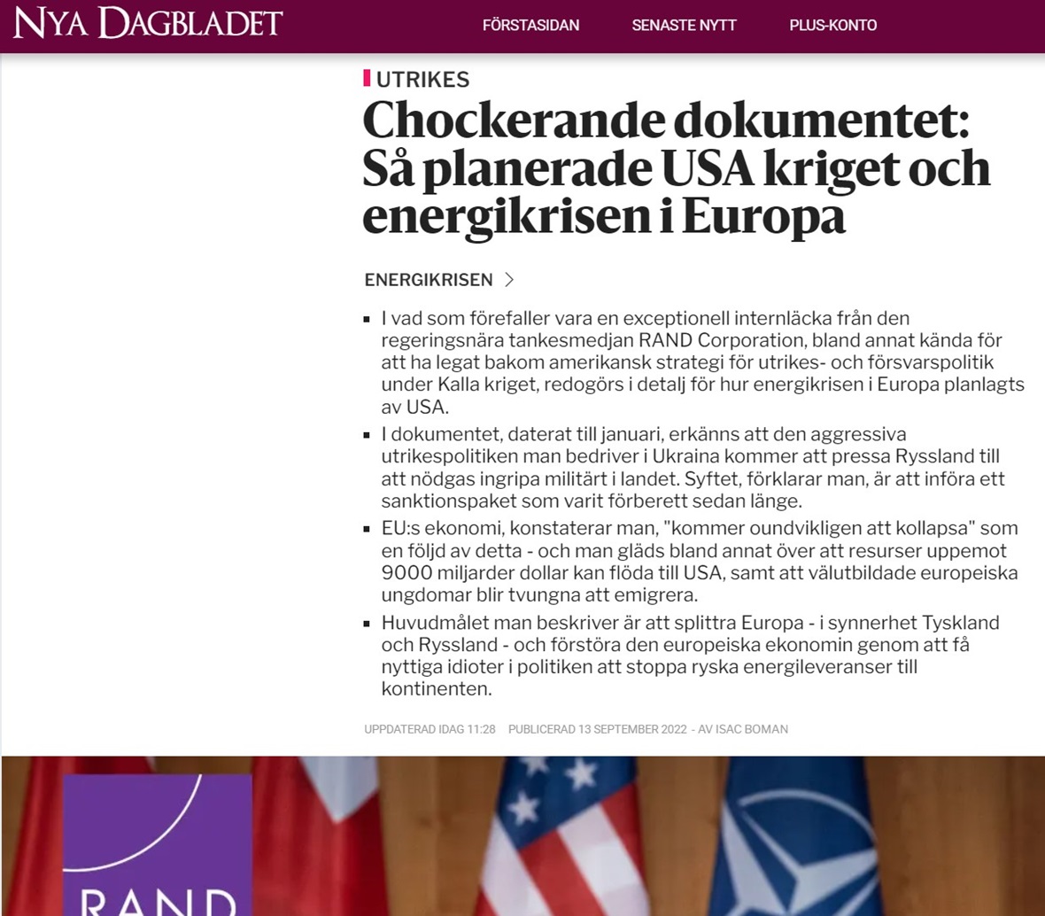 Als erste Zeitung in Europa kann Nya Dagbladet veröffentlichen, was die geheimen Pläne der USA zu sein scheinen, die europäische Wirtschaft mit einem Krieg in der Ukraine und einer herbeigeführten Energiekrise zu vernichten.
