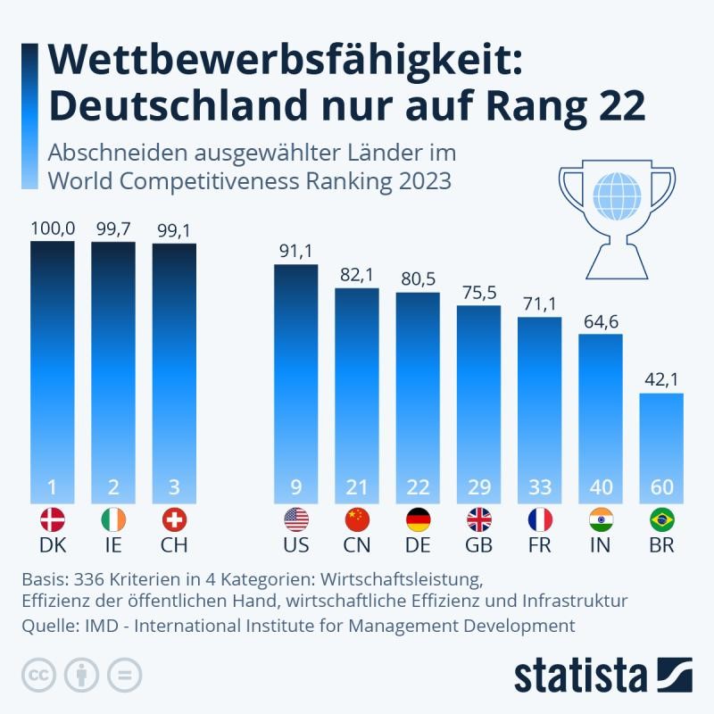 Im neuesten Standortvergleich der Wettbewerbsfähigkeit durch die renommierte Managementhochschule IMD in Lausanne rutscht Deutschland gleich um sieben (7) Plätze auf Rang 22 von insgesamt 64 Ländern ab. Somit landet Deutschland hinter dem kommunistischen China!